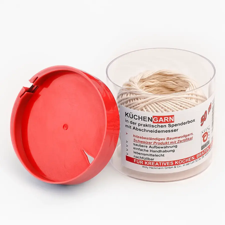 Warum die Box besser ist als das Knäuel: Das Garn liegt nicht offen auf der Arbeitsfläche, wo es mit Fleischsaft oder Fett in Berührung kommen könnte, bevor du es brauchst. Es bleibt geschützt in der praktischen Spenderbox. Du ziehst nur so viel heraus, wie du benötigst, und trennst es direkt am integrierten Abschneider im Deckel ab. Zu deiner Sicherheit ist dieser mit einem speziellen Messerschutz ausgestattet.